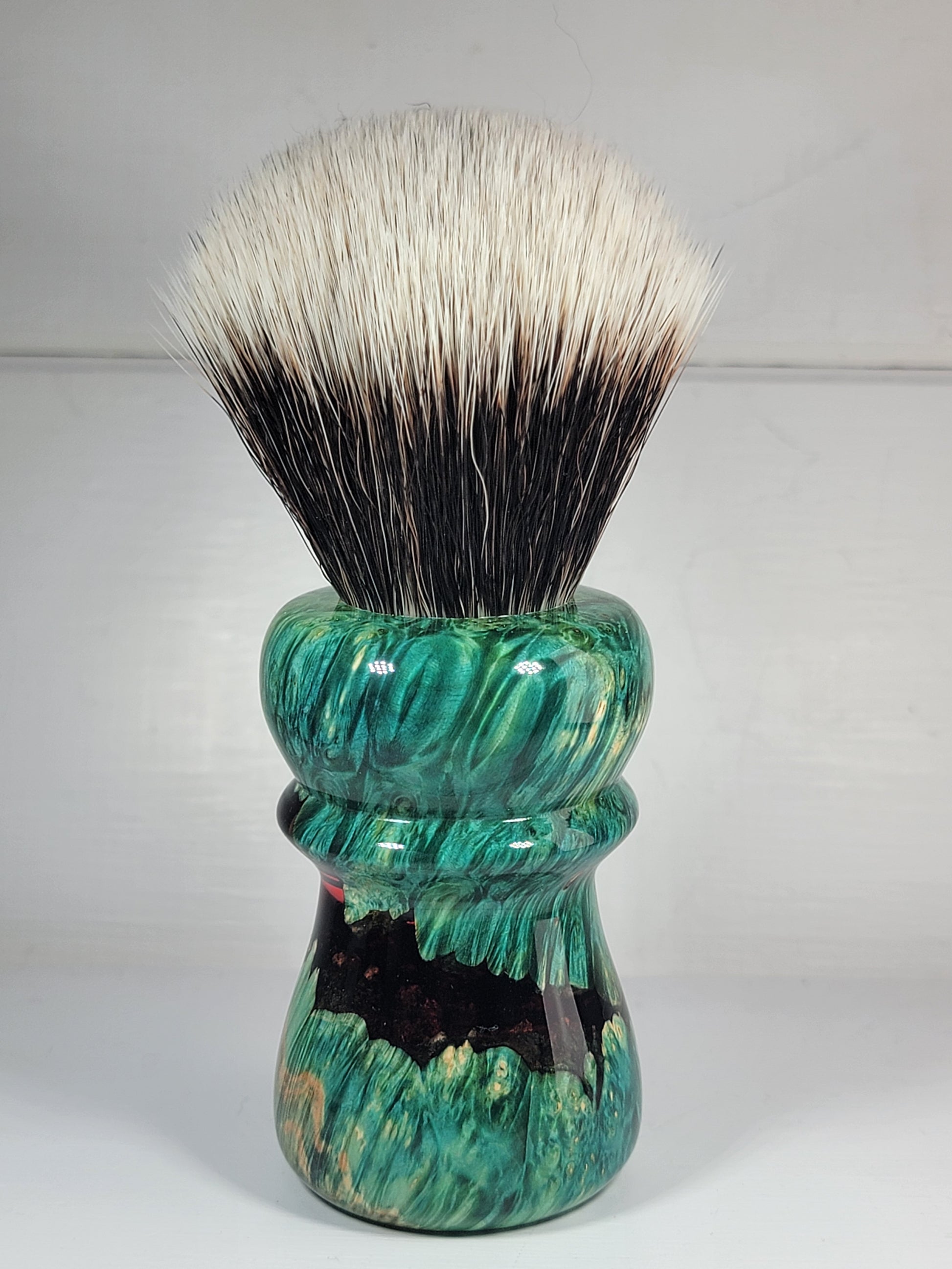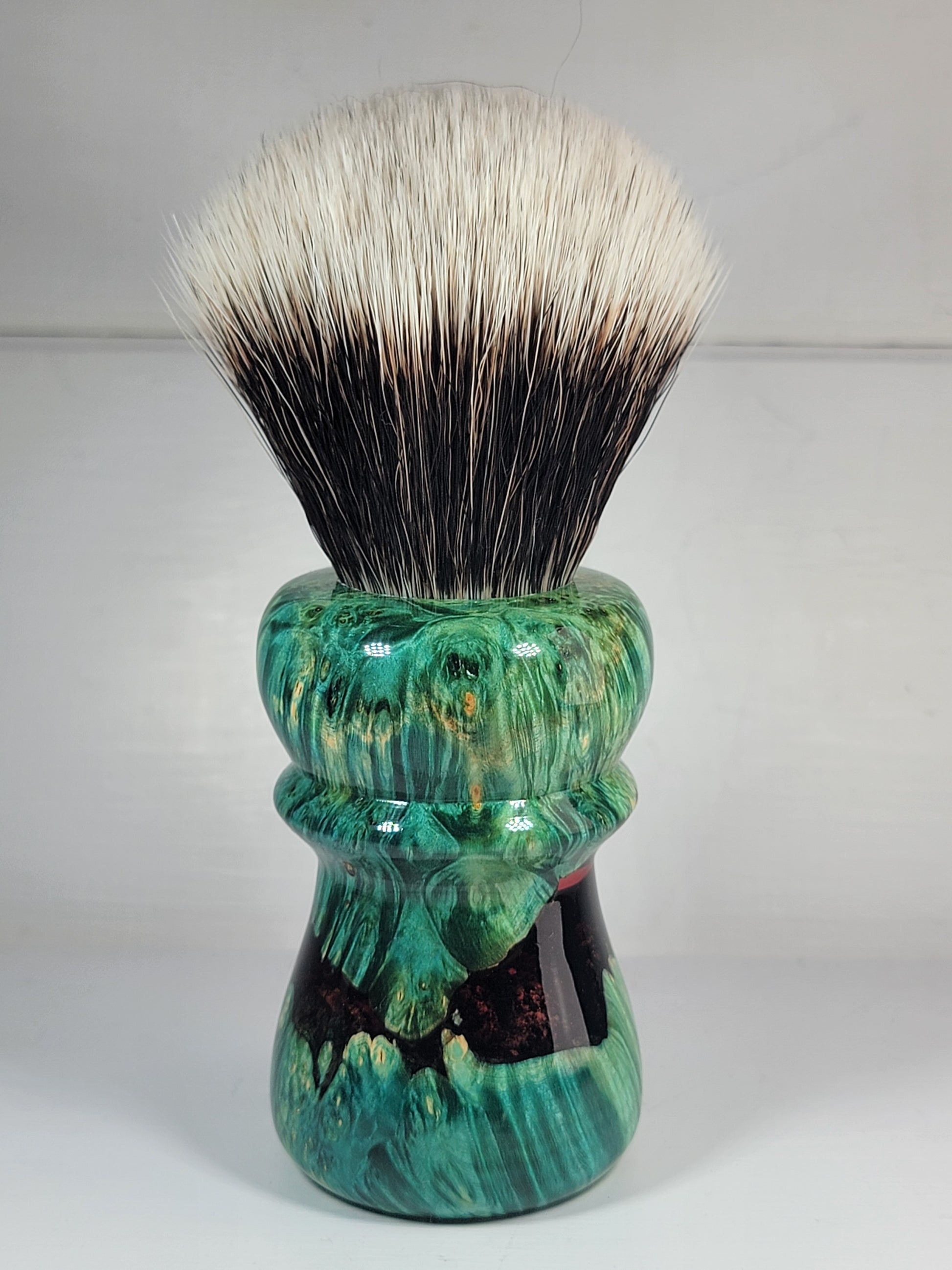 "Salty Croc" 26mm is a hybrid shave brush made with dyed wood and hand mixed and poured resin. The handle consists of highly figured burl wood that has been dyed in "sea green" and matched with a deep ruby red resin. The resin also has shimmery flecks!!