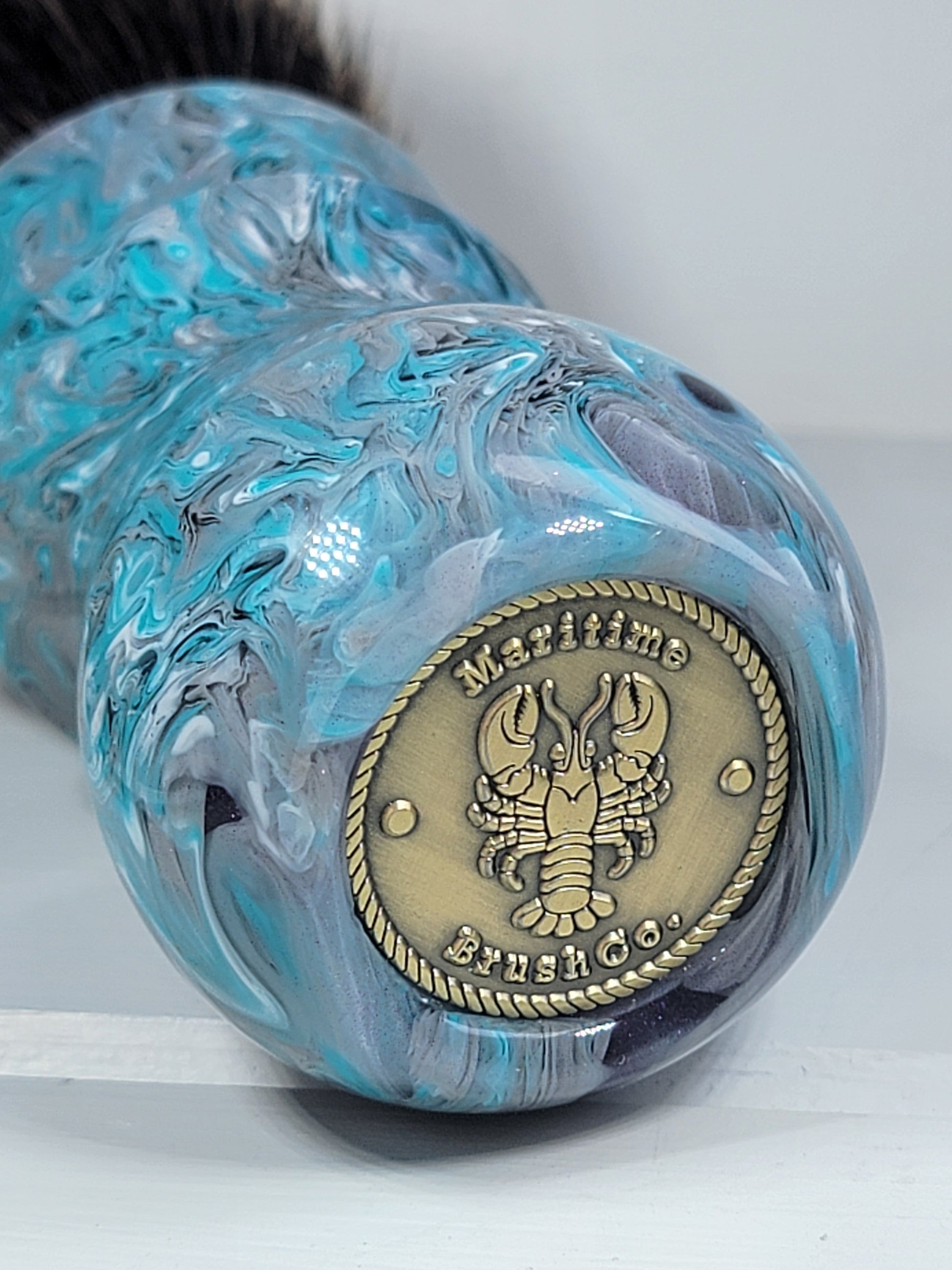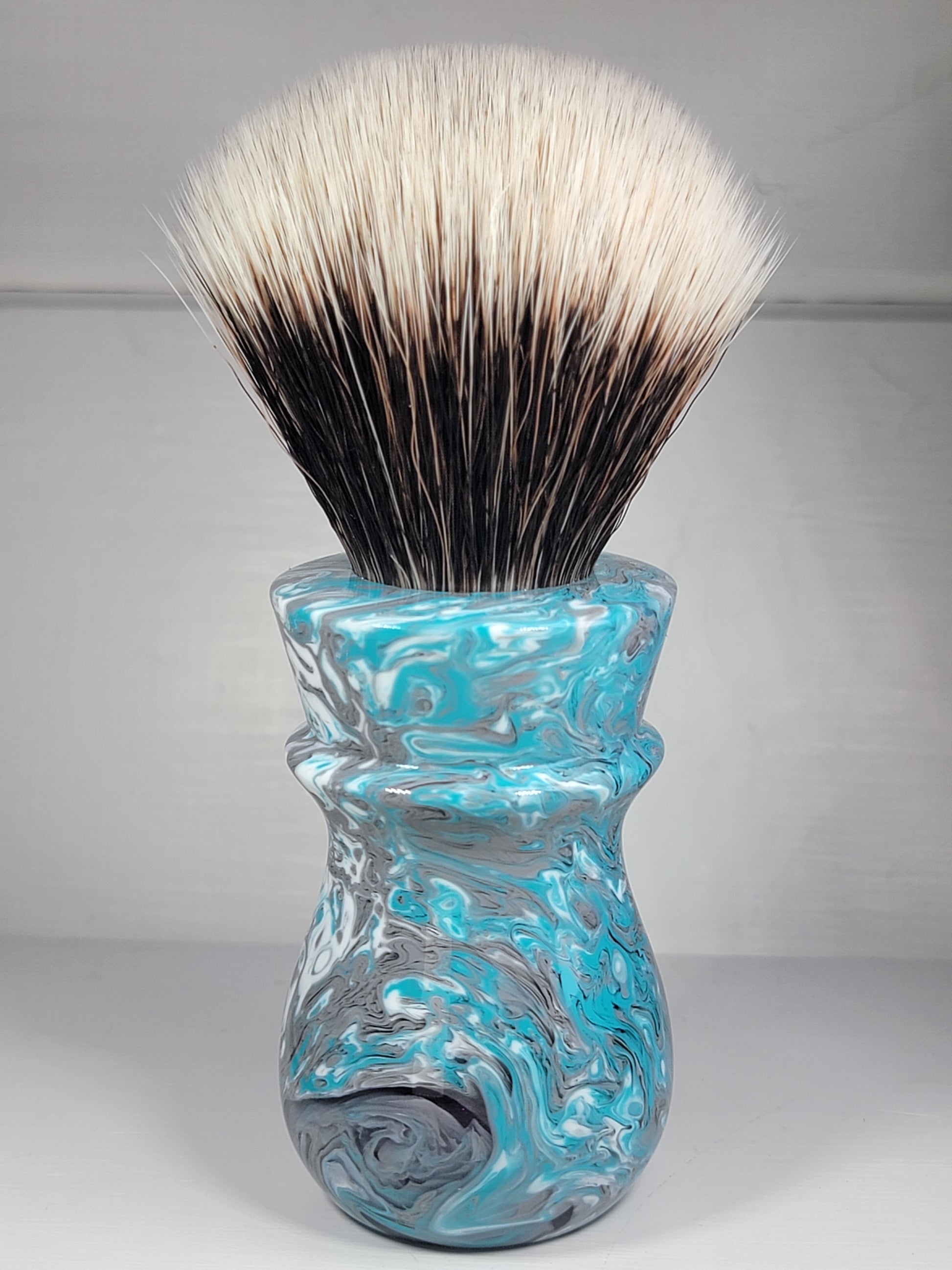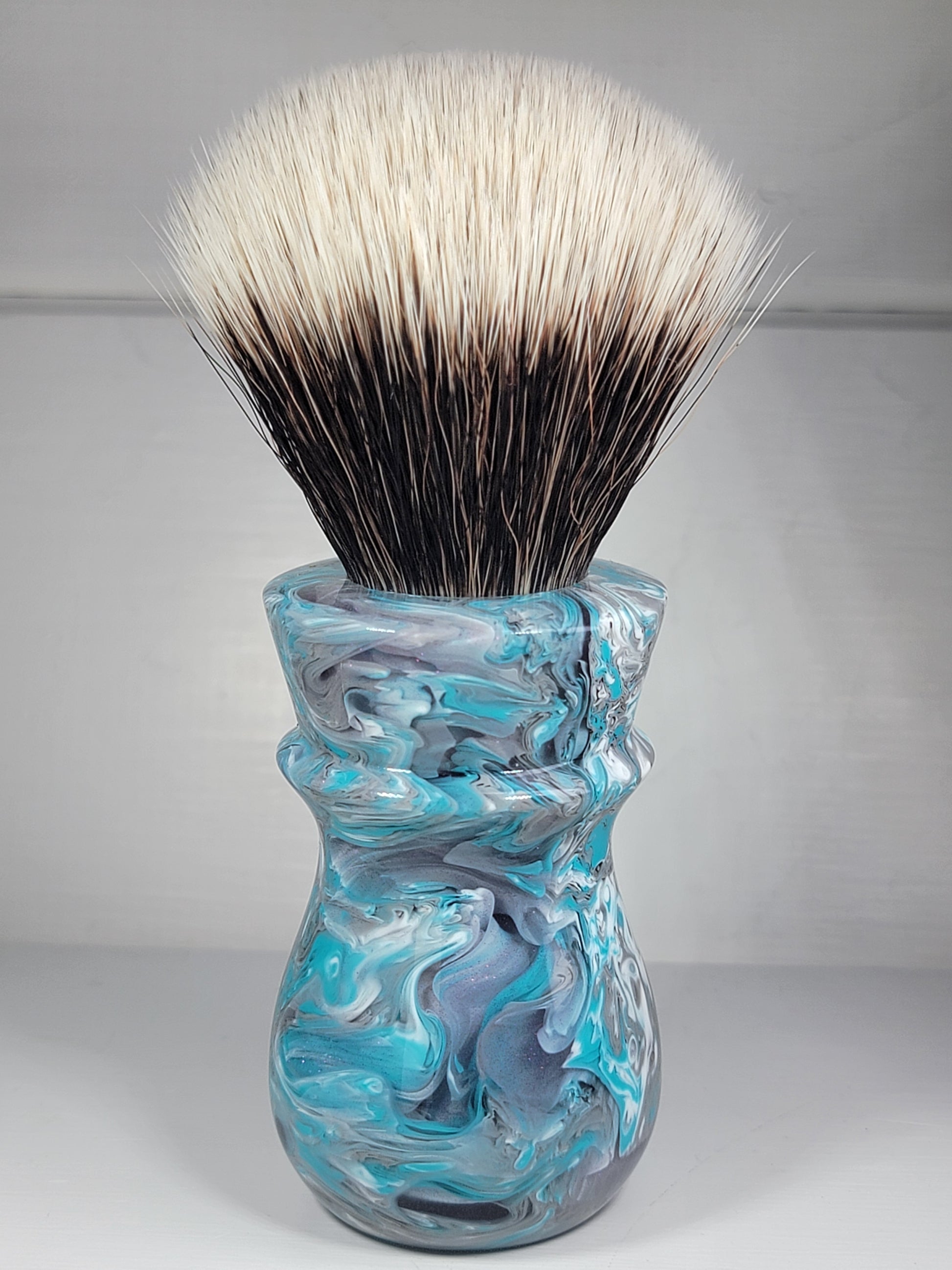 "Tropical Storm" 24mm is an all resin shave brush handle made with hand mixed and poured resin. This beautiful handle has a lot of depth and swirls. The resin consists of swirls of sky blue, white and tinted resin with lots of shimmer. The handle has also been hand finished to a high gloss.